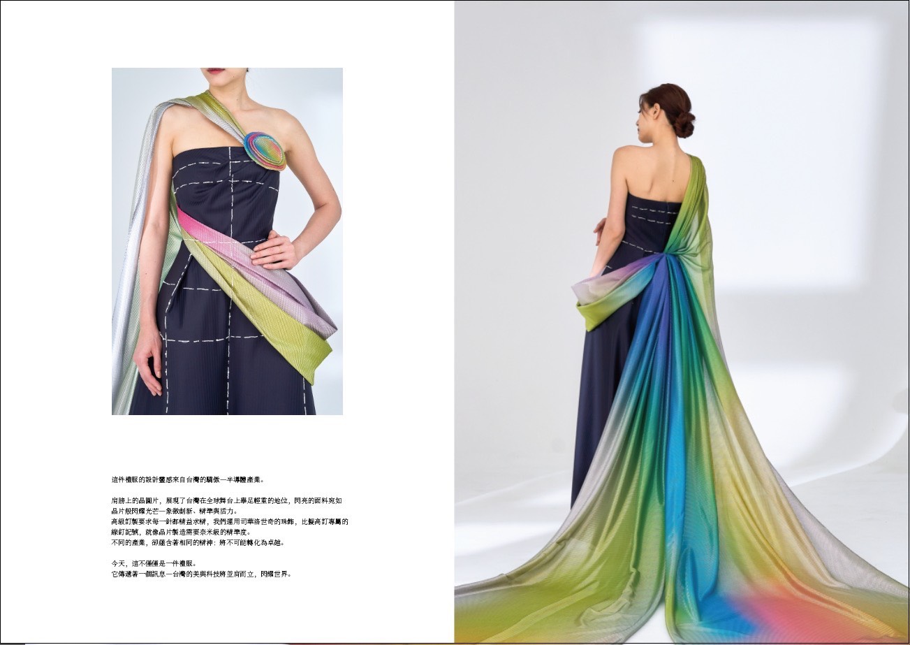 她所設計的高級訂製禮服,肩膀上特別點綴晶圓片,象徵台灣在全球半導體產業中舉足輕重的地位。閃耀的面料彷彿晶片般散發光芒,展現出科技的精準與活力。服裝更巧妙運用司華洛世奇珠飾,模擬高訂服裝製作中的線釘記號,細膩程度如同晶片製造所需的奈米級精準,充分詮釋高訂工藝的極致精神。