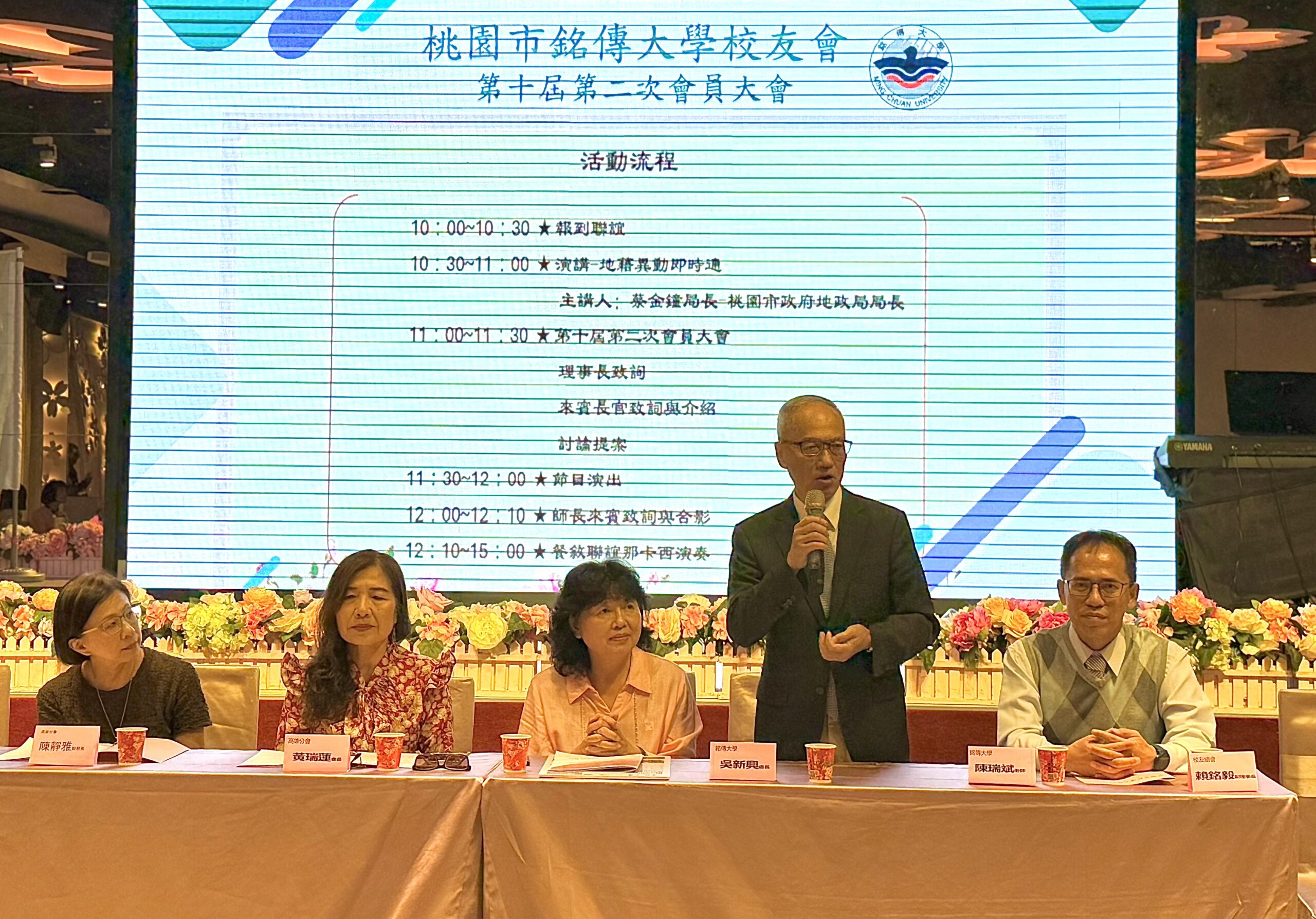 吳新興處長於致詞中表示,他非常高興能與校友總會及各地分會代表齊聚一堂,見證桃園校友會的凝聚力與活力。吳處長表示,桃園校友會在黃德芬會長的帶領下,會務蒸蒸日上,凝聚桃園校友的向心力,令人感佩。他也邀請校友們常回母校走走,親身感受銘傳的成長與蛻變,並期盼校友們發揮影響力,邀請更多畢業校友加入校友會,壯大校友網絡,為母校發展貢獻心力。