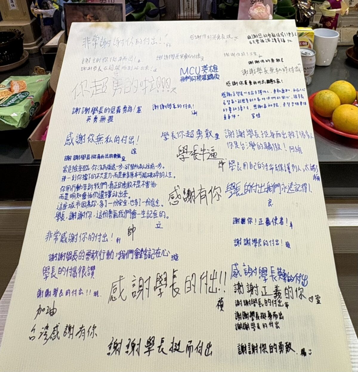 銘傳經濟系的學弟妹也特別製作一張大卡片給這位英雄學長表達哀思與敬佩。這份以生命保護他人的勇氣,令人動容,也成為社會最深刻的示範。