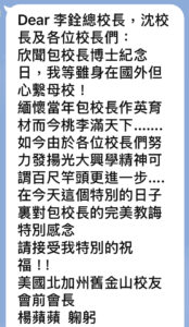 楊蘋蘋前會長表示,雖然身處國外,但校友們始終心繫母校。她回憶起包創辦人當年辛勤「作育英才」,如今已是「桃李滿天下」。楊前會長同時也對李銓總校長、沈佩蒂前校長及李選士校長的努力表示肯定,稱讚校方發揚光大興學精神,使母校發展「百尺竿頭,更進一步」,並致上特別的祝福(全文詳見下方圖片)。