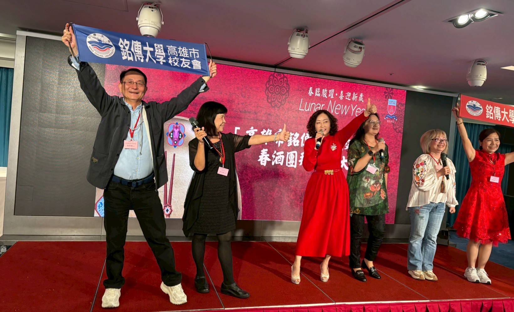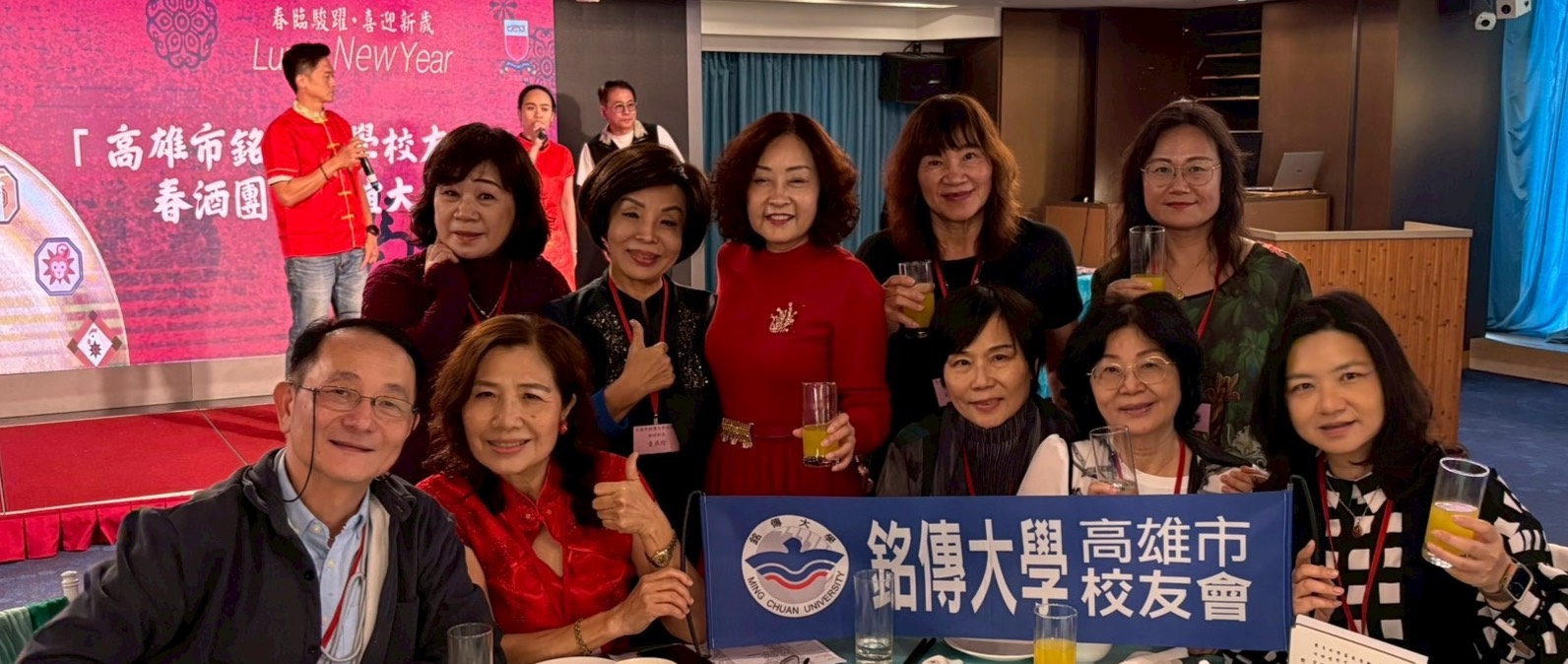 春酒團拜活動由李佩玲校友主持,播放〈恭喜發財〉影片,在帶動唱彼此互相拜年中揭開序幕,校友齊唱校歌,各系校友代表大合唱輪番登場,多位《愛唱歌的人》校友更在卡拉OK歡唱中炒熱氣氛,齊跳《我們都是一家人》,大家手牽手環繞全場舞蹈,笑聲與歌聲交織,展現銘傳人的團結與活力,現場年節氣氛濃厚、歡笑不斷。
